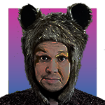Promo for Super Fest on November 7-8 at Ostpol, featuring a playlist including artists like David Bowie and The Surfrajettes, with a black-and-white photo of a person wearing a furry hat with bear ears and glasses, holding vinyl records.